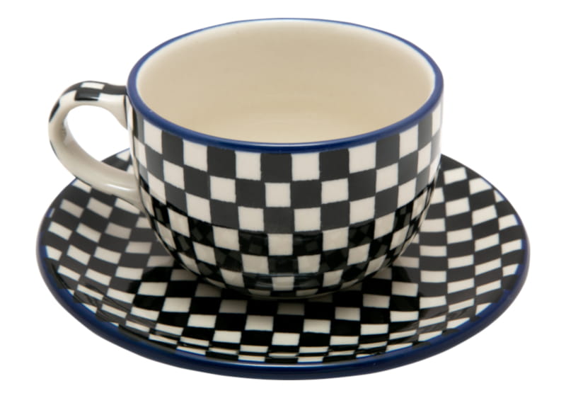 Boleslawiec pottery - handpainted. Unique pattern in a vintage style, black-white chessboard. Border in navy blue.