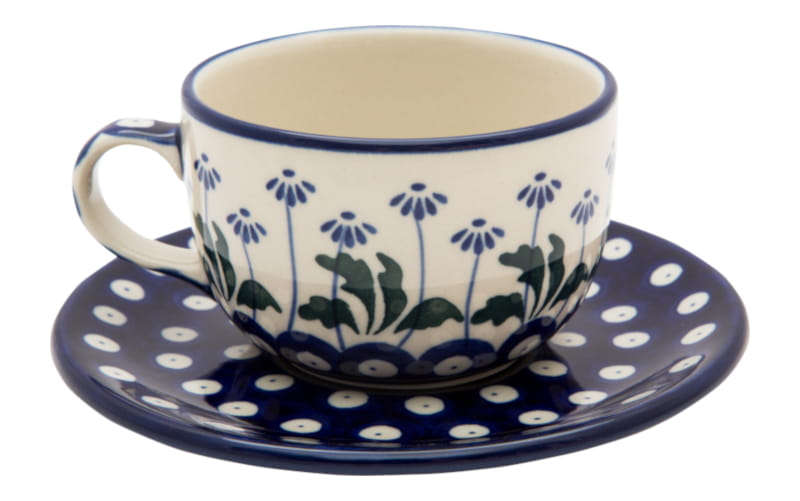 Boleslawiec pottery - handpainted. Classic pattern with plant motifs. Border in navy blue.