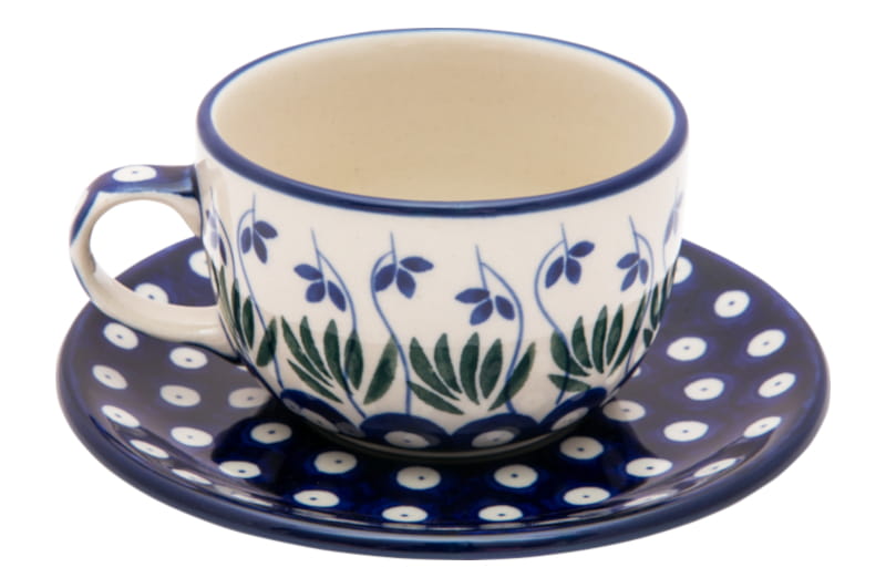 Boleslawiec pottery - handpainted. Classic pattern with plant motifs. Border in navy blue.