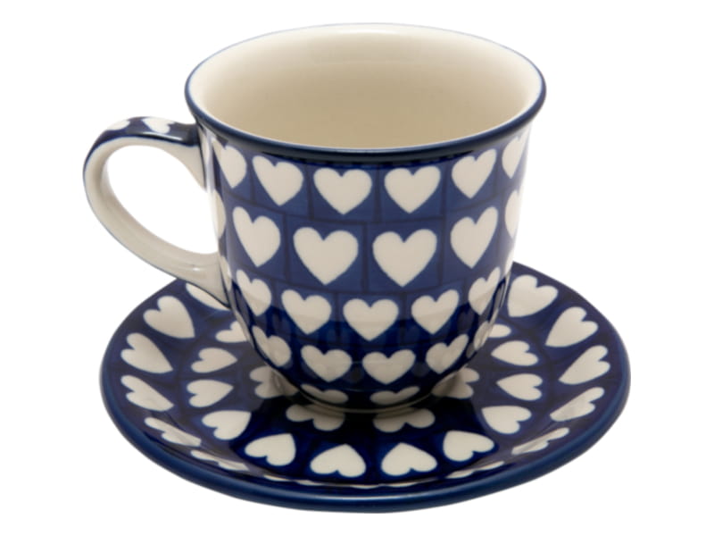 Boleslawiec pottery - handpainted. Classic pattern in a vintage style. White hearts on a navy blue background. Border in navy blue.