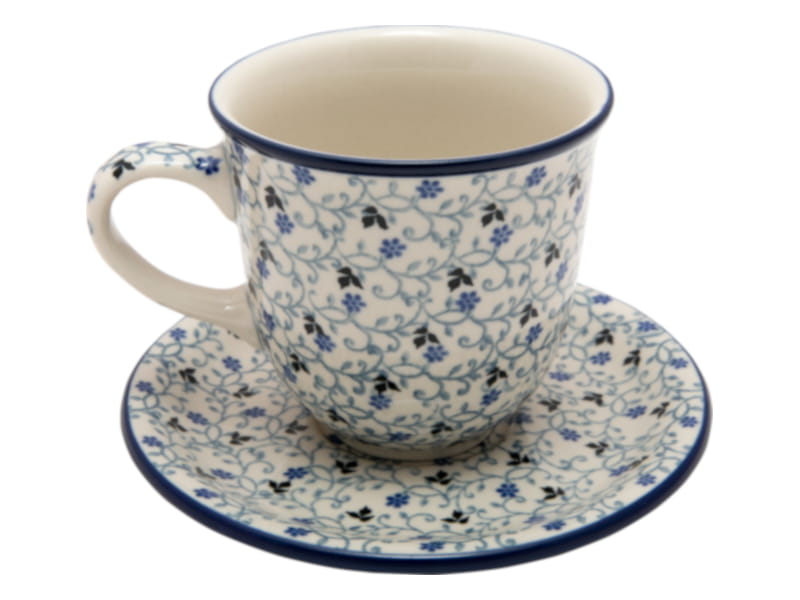 Wzór z motywem roślinnym i kwiatowym z dominującym kolorem granatowym. Wykończenie obrzeża w kolorze granatowym. Ceramika Bolesławiec - Handmade.