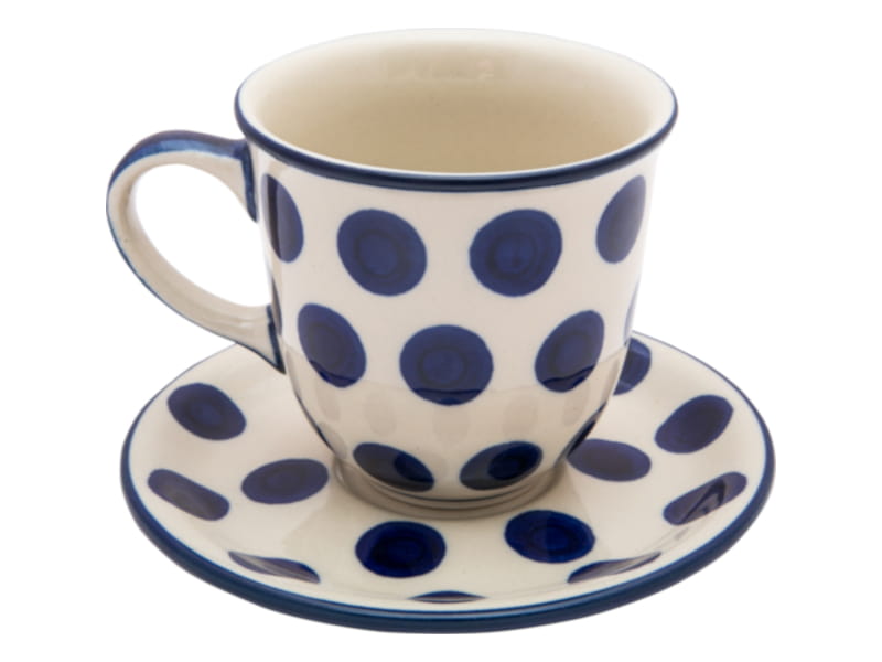 Boleslawiec pottery - handpainted. Vintage style pattern - large dots in navy blue. Border in navy blue.