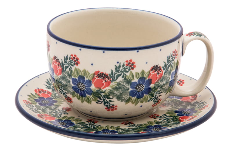 Ceramika Bolesławiec - HANDMADE. Wzór KWIATOWY z kwiatami w kolorach czerwonym i granatowym. Wykończenie obrzeża w kolorze granatowym.