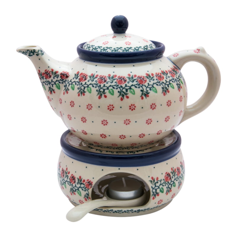 Teapot with strainer for brewing tea and herbs. Boleslawiec pottery - handpainted. Floral pattern with dominant red. Border in navy blue.