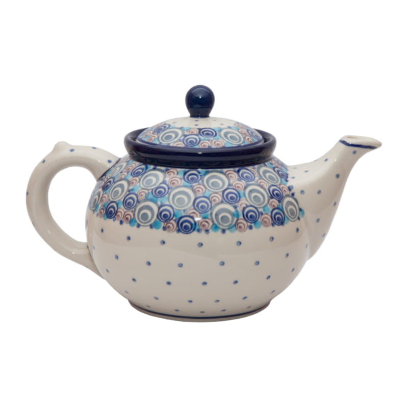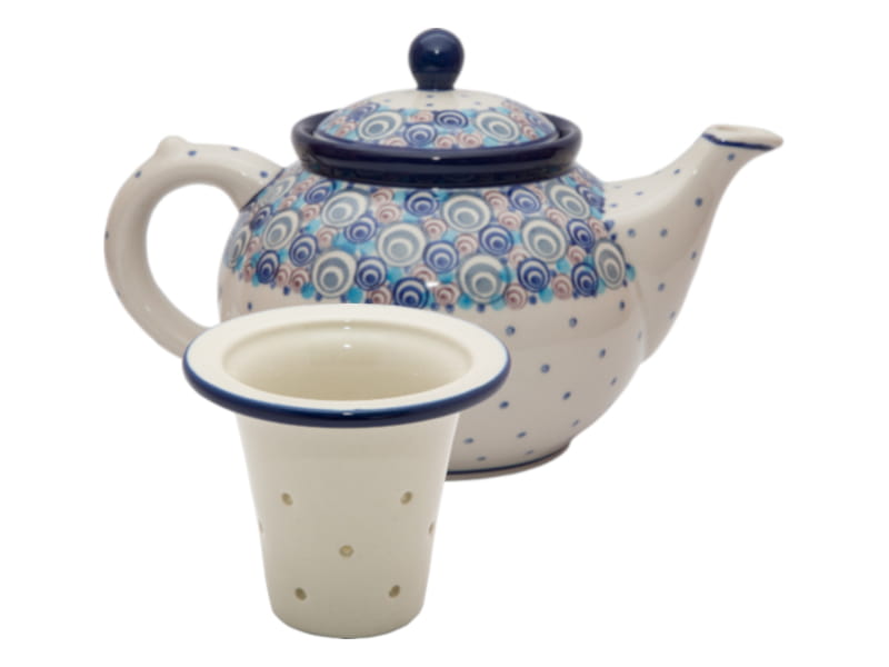 Teapot with strainer for brewing tea and herbs. Boleslawiec pottery - handpainted. Vintage style pattern. Colorful peacock feathers motif. Border in navy blue.
