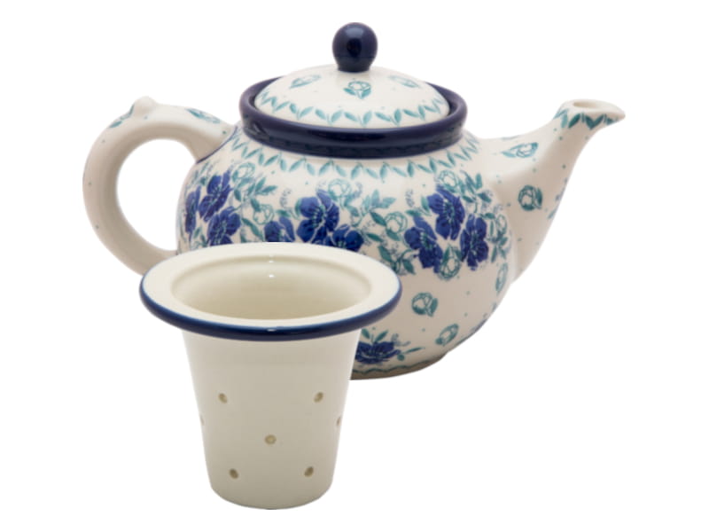 Teapot with strainer for brewing tea and herbs. Boleslawiec pottery - handpainted. Classic pattern with a floral motif with dominant navy blue. Border in navy blue.