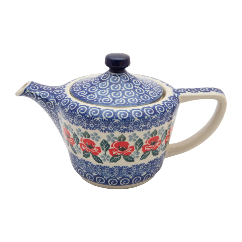 Teapot with strainer for brewing tea and herbs. Boleslawiec pottery - handpainted. Floral patttern in red. Border in creamy white (natural firing color).