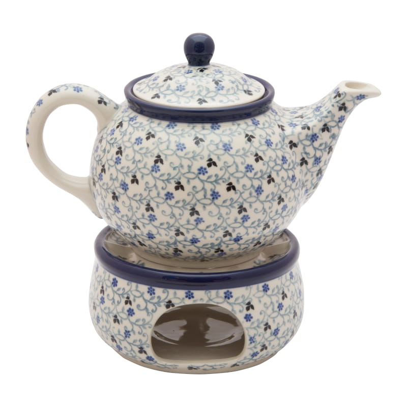 Teapot with strainer for brewing tea and herbs. Boleslawiec pottery - handpainted. Pattern with a floral and plant motif with dominant navy blue. Border in navy blue.