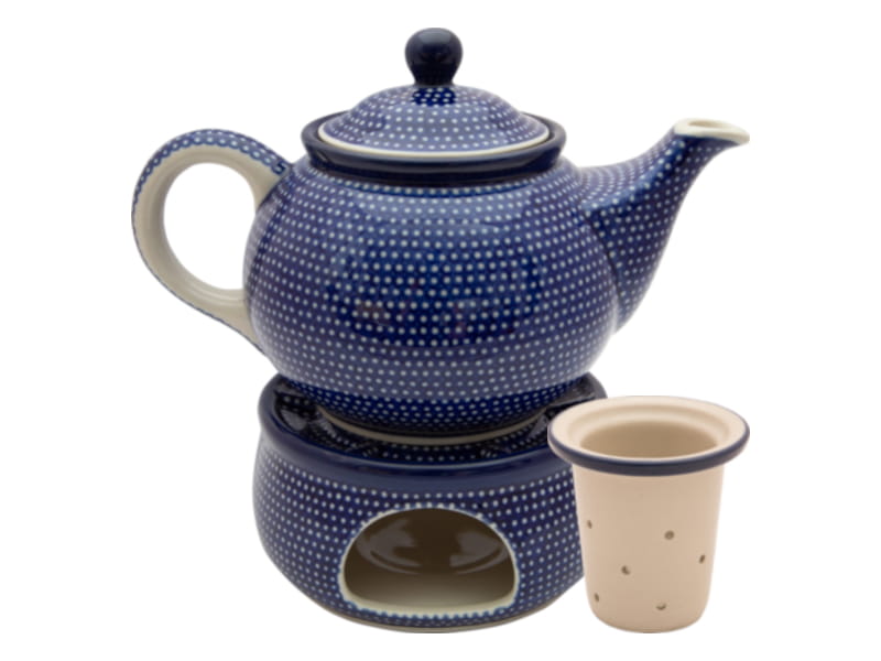 Teapot with strainer for brewing tea and herbs. Unique pattern in a classic style, fine dots on a navy blue background. Border in navy blue. Boleslawiec pottery - handpainted.