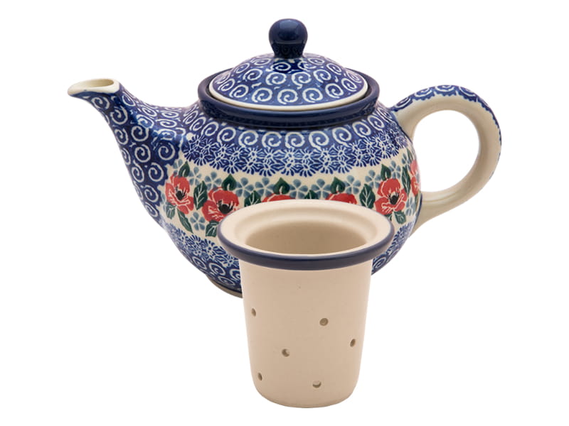 Teapot with strainer for brewing tea and herbs. Boleslawiec pottery - handpainted. Floral patttern in red. Border in navy blue.