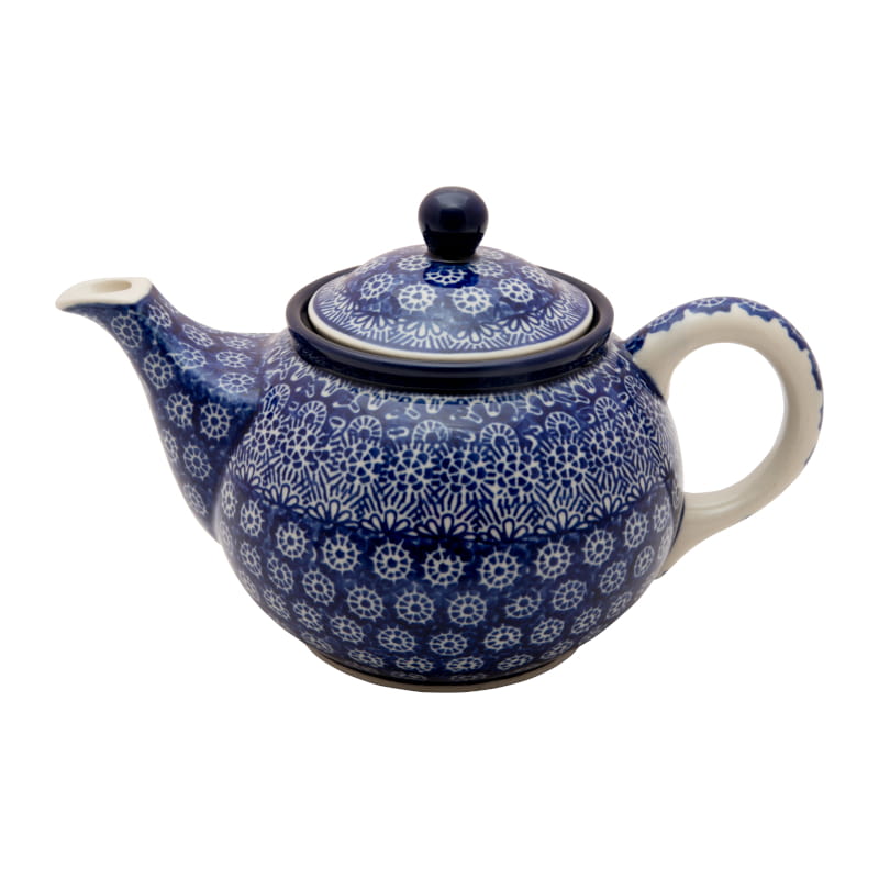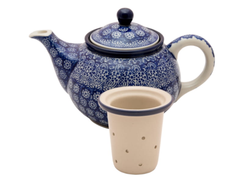 Teapot with strainer for brewing tea and herbs. Boleslawiec pottery - handpainted. Ornamental pattern in navy blue. Border in navy blue.