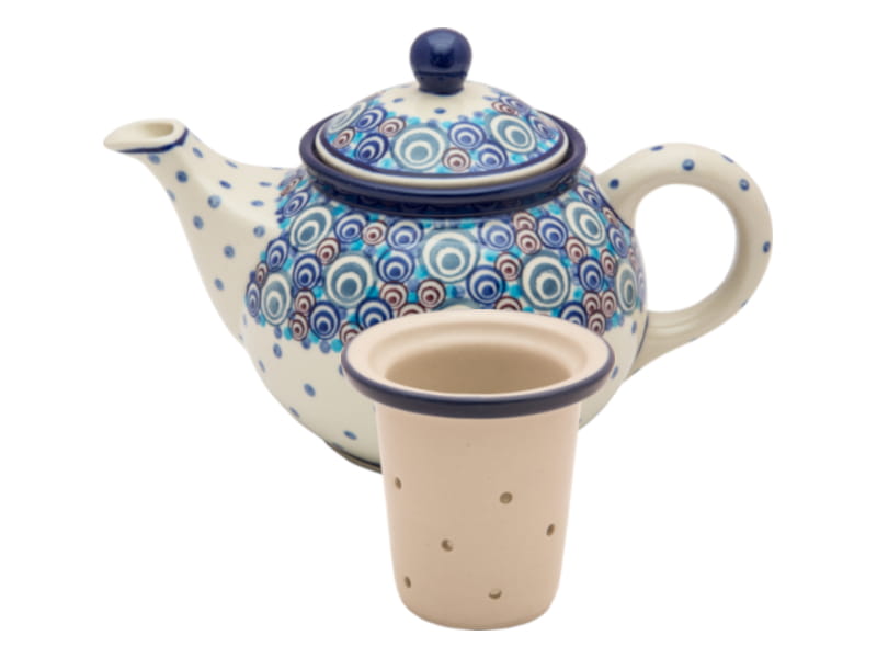 Teapot with strainer for brewing tea and herbs. Boleslawiec pottery - handpainted. Vintage style pattern. Colorful peacock feathers motif. Border in navy blue.