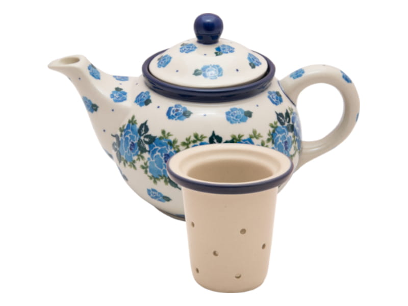 Teapot with strainer for brewing tea and herbs. Boleslawiec pottery - handpainted. FLOWER pattern in blue. Border in navy blue.