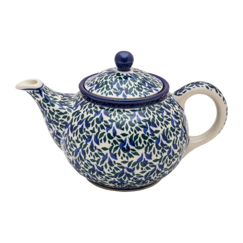 Teapot with strainer for brewing tea and herbs. Boleslawiec pottery - handpainted. Plant pattern in navy blue and green. Border in navy blue.