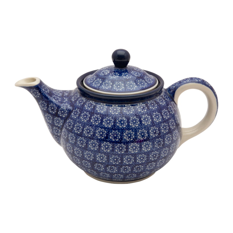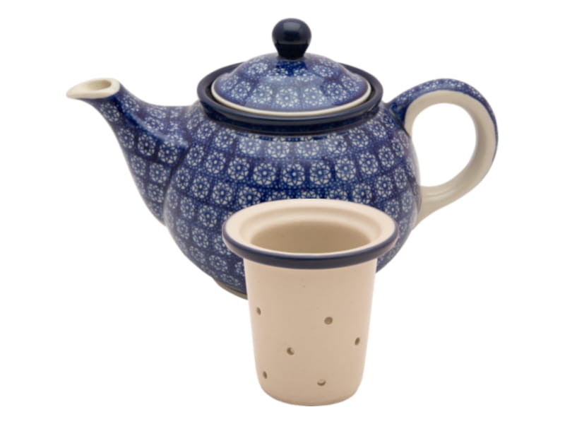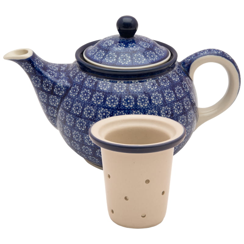 Teapot with strainer for brewing tea and herbs. Boleslawiec pottery - handpainted. Ornamental pattern in navy blue. Border in navy blue.
