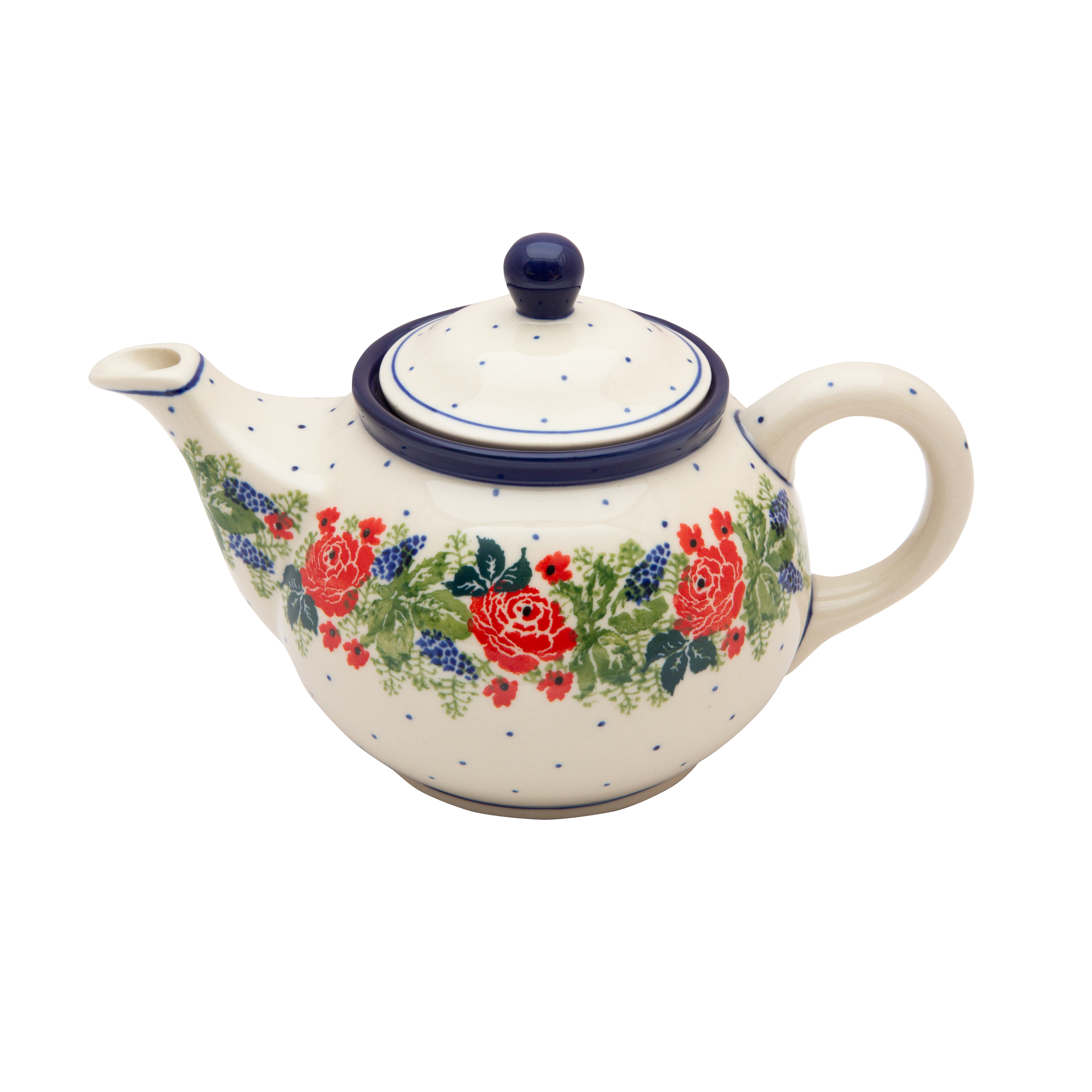 Boleslawiec pottery - handpainted. Floral pattern in red, blue and green. Roses, poppies and delphinium. The edge in navy blue.