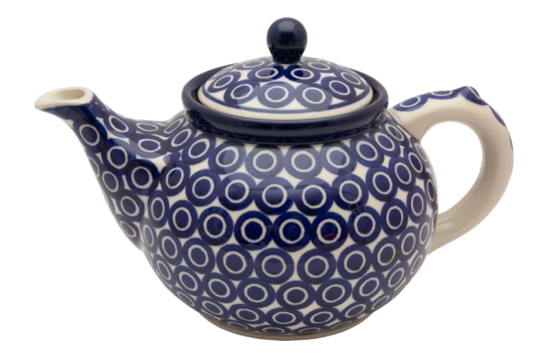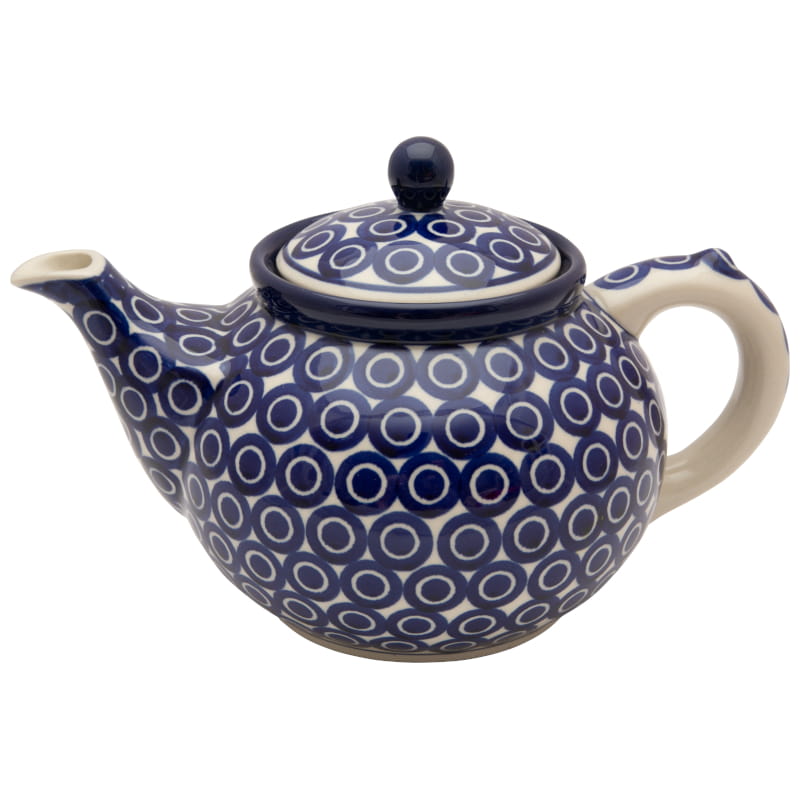 Boleslawiec pottery - handpainted. Classic pattern in a vintage style - large eye-like circles on a white background. Border in navy blue.
