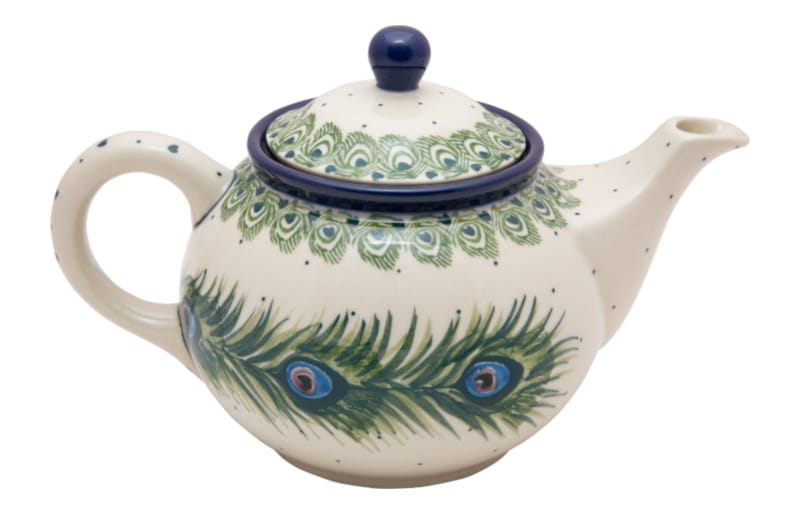 Boleslawiec pottery - handpainted. Pattern in green and cobalt blue. Unique peacock feathers motif. Border in navy blue.