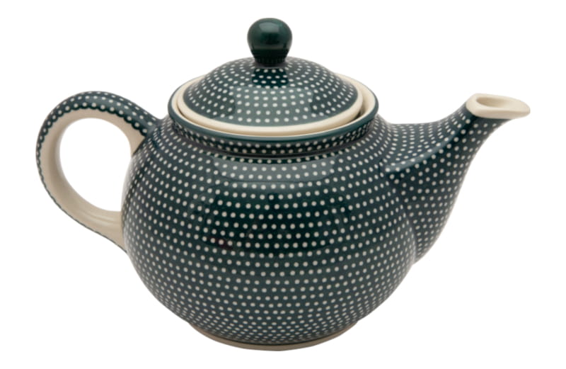 Boleslawiec pottery - handpainted. Unique pattern in a classic style, fine dots on a bottle green background. Border in bottle green.