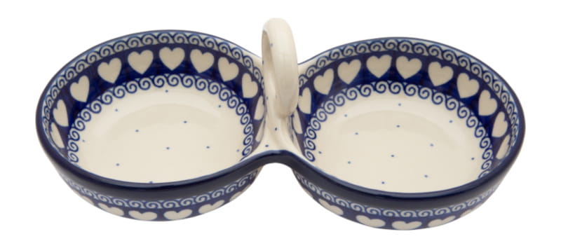Classic pattern - a strip of white hearts on a navy blue background, fine dots and spirals in navy blue. Border in navy blue. Boleslawiec pottery - handpainted.