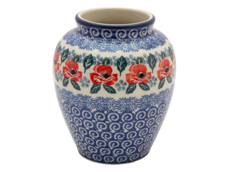 Ceramika Bolesławiec - Handmade. Wzór KWIATOWY w kolorze czerwonym. Wykończenie obrzeża w kolorze granatowym.