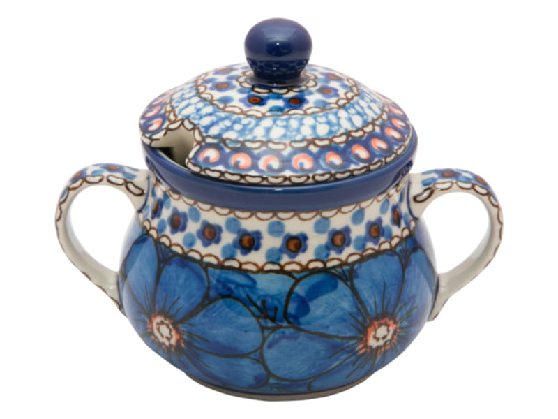 Ceramika Bolesławiec - HANDMADE. Wzór kwiatowy w dominujących kolorach: granatowym i niebieskim. Wykończenie obrzeża w kolorze kremowym (naturalny kolor wypalania).