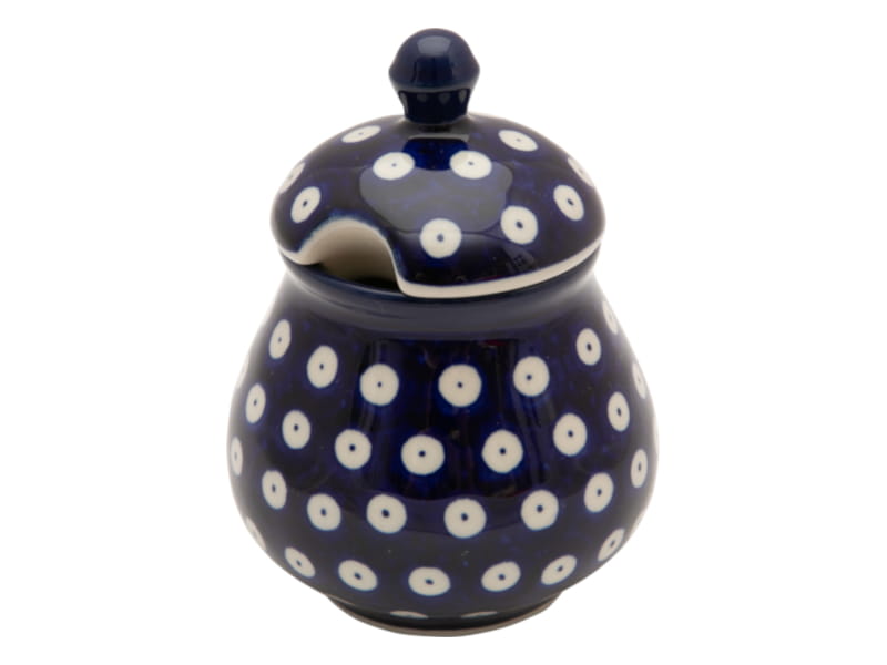 Wzór KLASYCZNY z tłem w kolorze granatowym. Klasyczne kropki Bolesławiec. Wykończenie obrzeża w kolorze granatowym. Ceramika Bolesławiec - handmade.