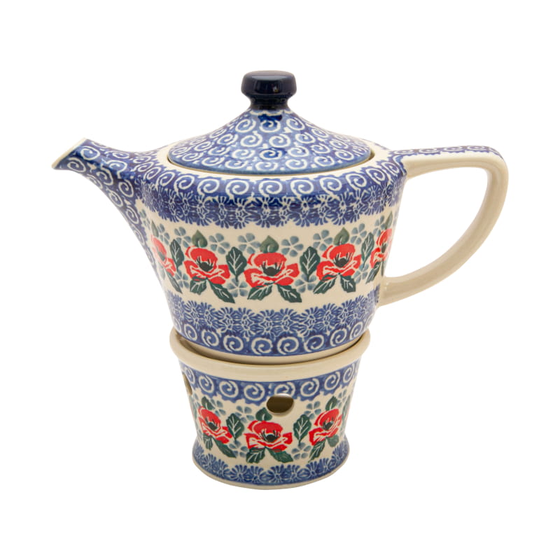 Czajnik z wyjmowanym sitkiem do parzenia ziół i herbaty. Ceramika Bolesławiec - Handmade. Wzór KWIATOWY w kolorze czerwonym. Wykończenie obrzeża w kolorze kremowym (naturalny kolor wypalania).