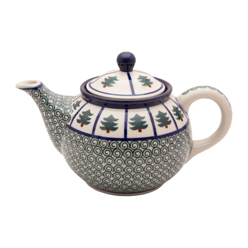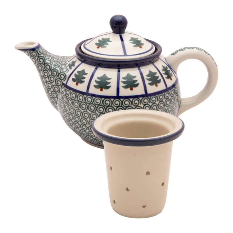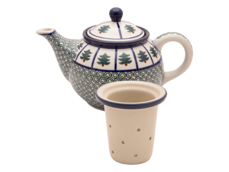 Czajnik z wyjmowanym sitkiem do parzenia ziół i herbaty. Ceramika Bolesławiec - HANDMADE. Wzór klasyczny w stylu VINTAGE - zielone spirale z elementami w kolorze granatowym i zielona choinka. Wykończenie obrzeża w kolorze granatowym.