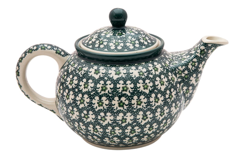 Ceramika Bolesławiec - HANDMADE. Wzór ornamentowy w kolorze zielonym. Wykończenie obrzeża w kolorze zielonym.