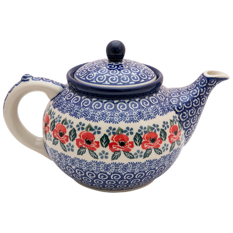 Czajnik z wyjmowanym sitkiem do parzenia ziół i herbaty. Ceramika Bolesławiec - Handmade. Wzór KWIATOWY w kolorze czerwonym. Wykończenie obrzeża w kolorze kremowym (naturalny kolor wypalania).