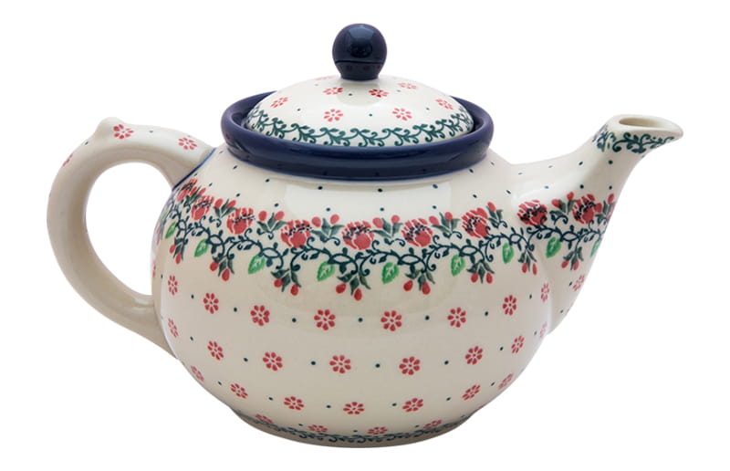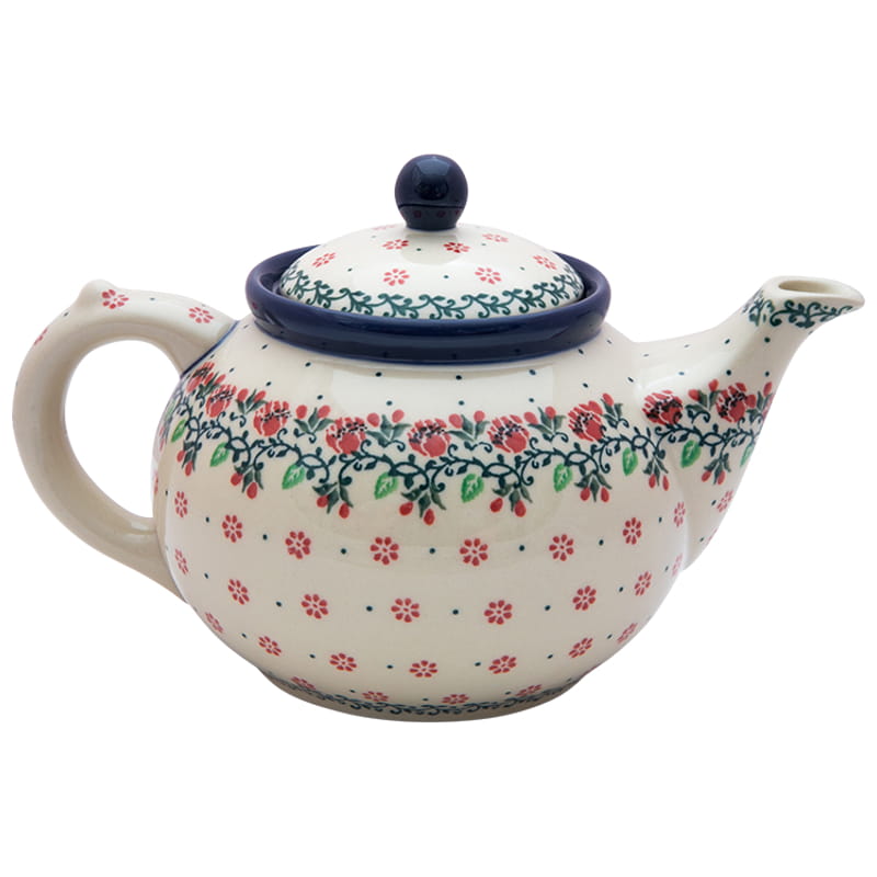 Czajnik z wyjmowanym sitkiem do parzenia ziół i herbaty. Ceramika Bolesławiec - HANDMADE. Wzór kwiatowy z dominującym kolorem czerwonym. Wykończenie obrzeża w kolorze granatowym.