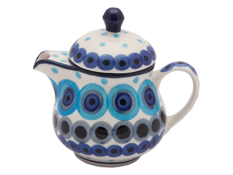 Czajnik z wyjmowanym sitkiem do parzenia ziół i herbaty. Ceramika Bolesławiec - HANDMADE. Wzór KLASYCZNY - drobny ornament i pawie oczka w kolorze granatowym. Wykończenie obrzeża w kolorze granatowym.