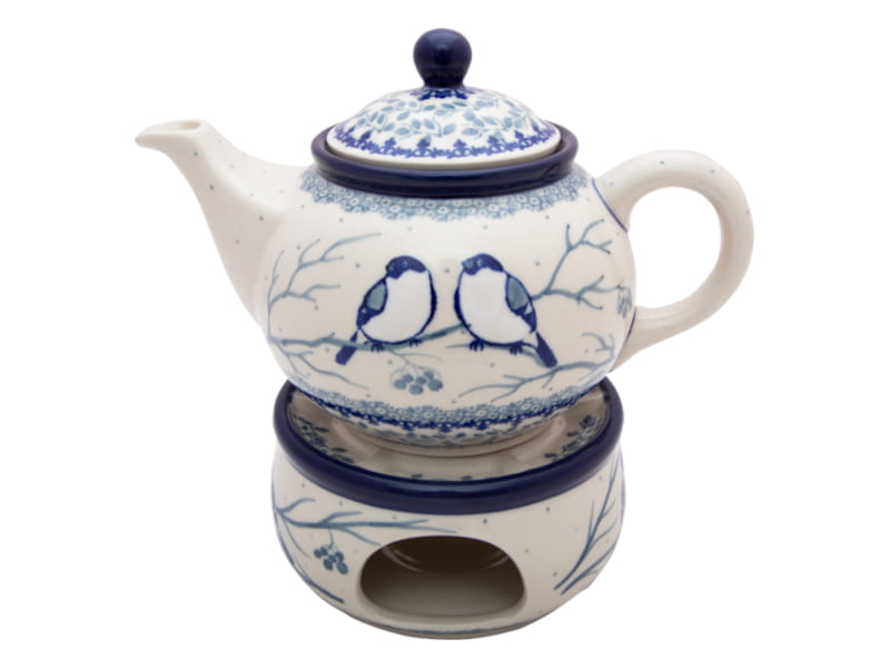 Czajnik z wyjmowanym sitkiem do parzenia ziół i herbaty. Wzór Unikatowy. Dwa ptaki w kolorach zimy. Wykończenie obrzeża w kolorze granatowym. Ceramika Bolesławiec - HANDMADE.