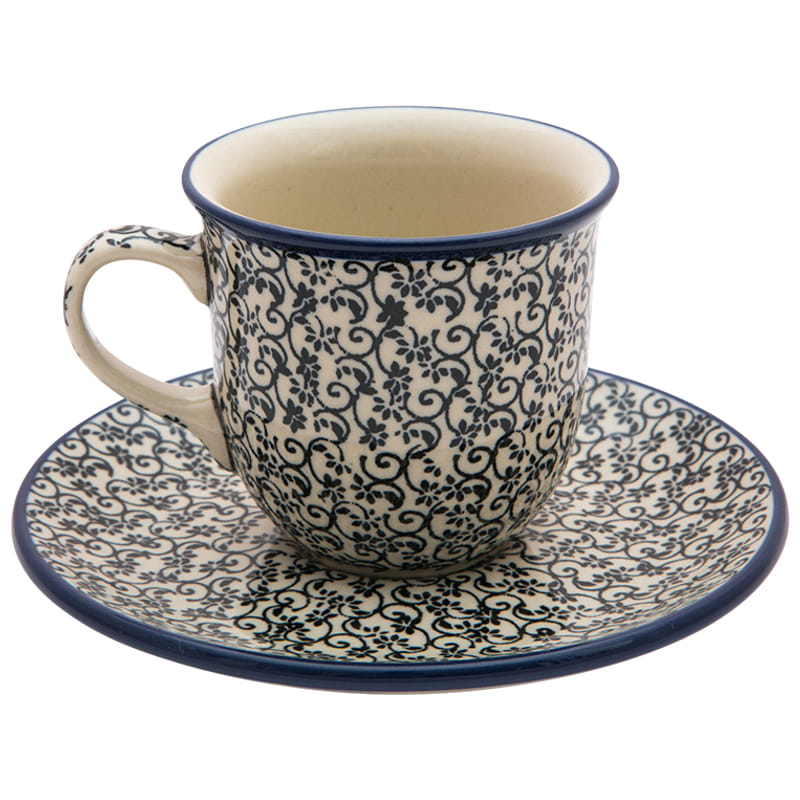 Ceramika Bolesławiec - HANDMADE. Wzór ORIENTALNY, ornamentowy w kolorze czarnym. Wykończenie obrzeża w kolorze granatowym.