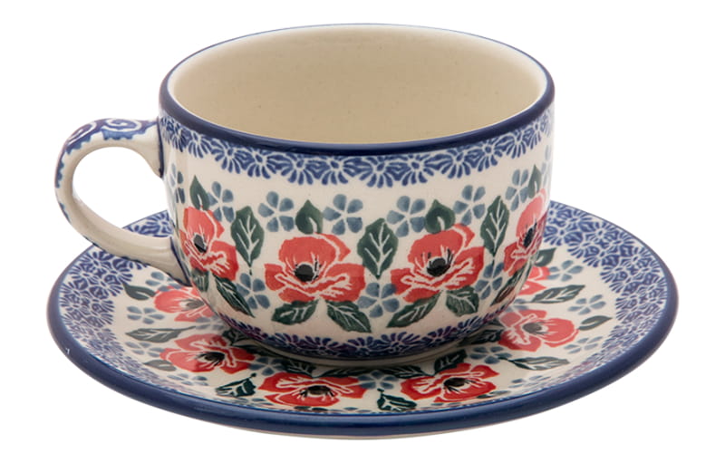 Ceramika Bolesławiec - Handmade. Wzór KWIATOWY w kolorze czerwonym. Wykończenie obrzeża w kolorze granatowym.