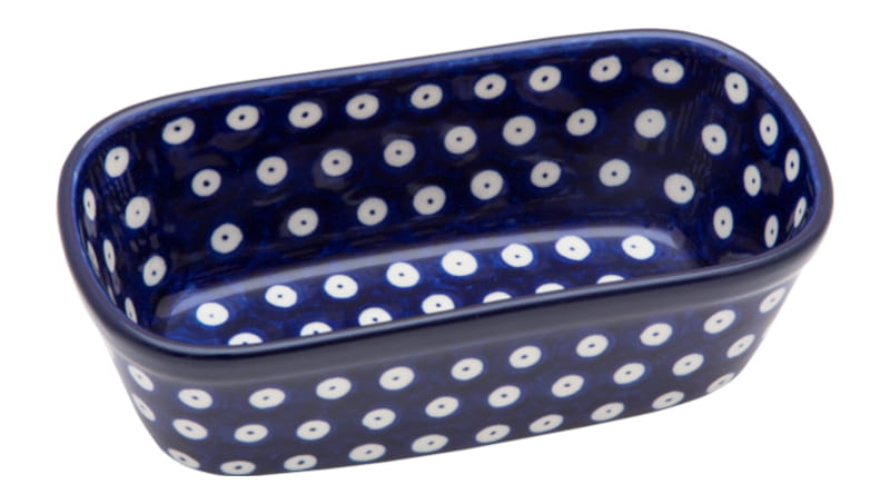 Wzór KLASYCZNY z tłem w kolorze granatowym. Klasyczne kropki Bolesławiec. Wykończenie obrzeża w kolorze granatowym. Ceramika Bolesławiec - handmade.