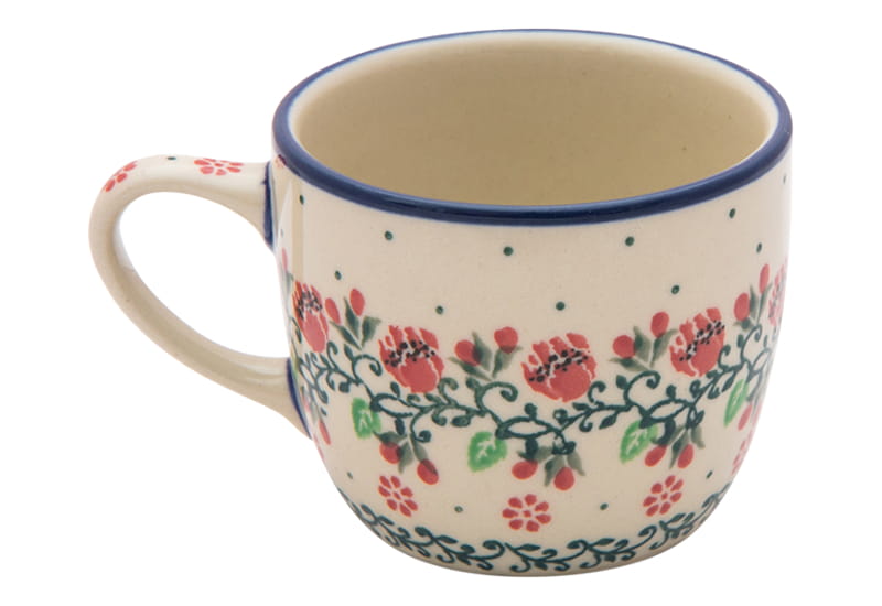 Ceramika Bolesławiec - HANDMADE. Wzór kwiatowy z dominującym kolorem czerwonym. Wykończenie obrzeża w kolorze granatowym.