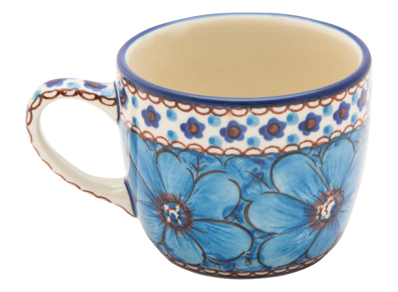 Ceramika Bolesławiec - HANDMADE. Wzór UNIKATOWY z kwiatami w kolorze jasnoniebieskim. Wykończenie obrzeża w kolorze granatowym.