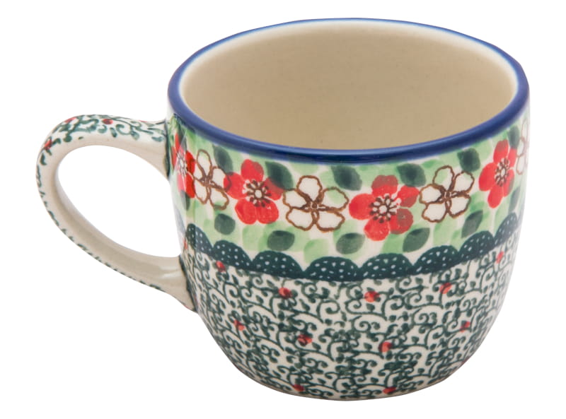 Ceramika Bolesławiec - Handmade. Wzór KWIATOWO-ORNAMENTOWY w kolorach: czerwonym i białym z elementami zieleni. Wykończenie obrzeża w kolorze granatowym.