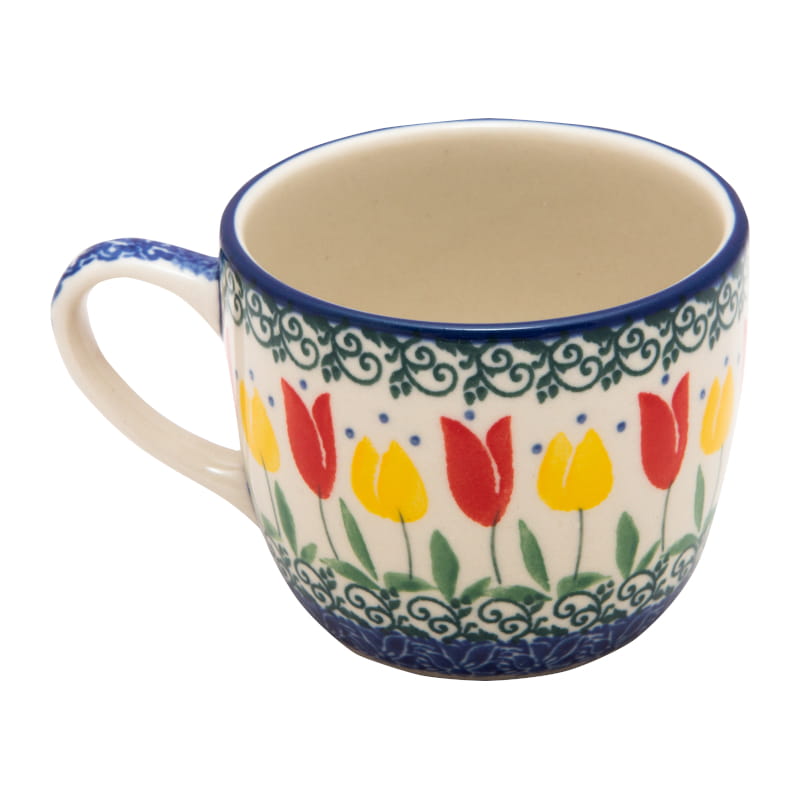 Wzór z tulipanami. Żółty pomiędzy czerwonymi. Delikatny, ornamentowy, butelkowo zielony i niebieski motyw roślinny wokół. Wykończenie obrzeża w kolorze granatowym. Ceramika Bolesławiec - Handmade.