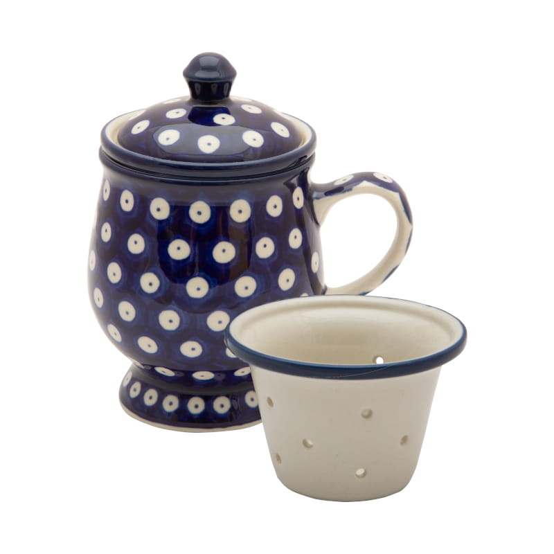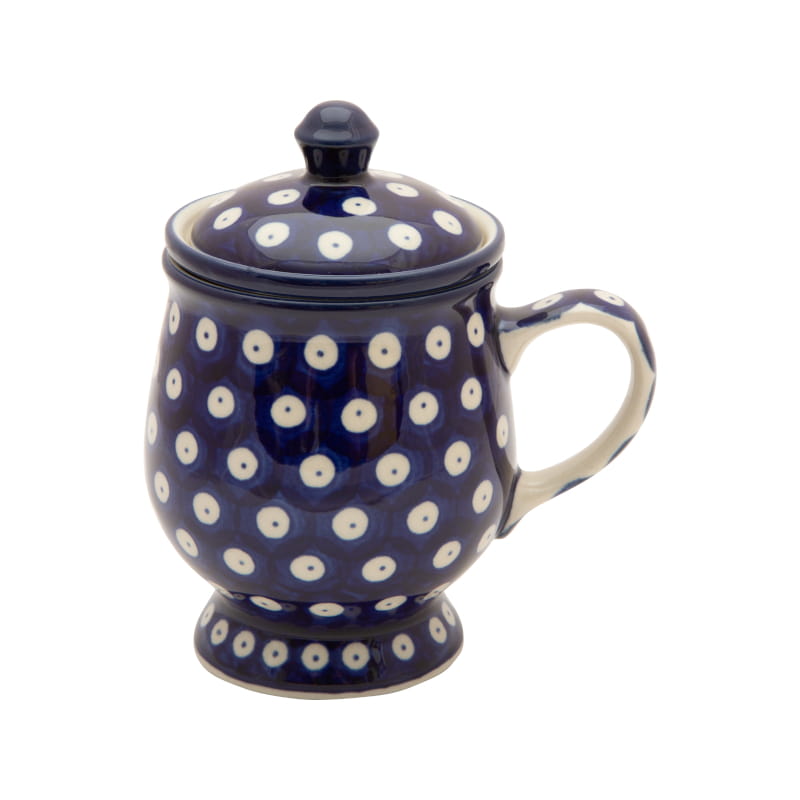 Kubek czeski baryłka z przykrywką, która po zdjęciu służy jako podstawka. Wzór KLASYCZNY z tłem w kolorze granatowym. Wykończenie obrzeża w kolorze granatowym. Ceramika Bolesławiec - HANDMADE.