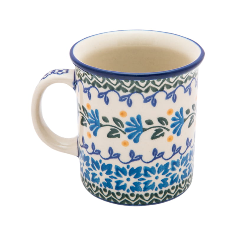 Ceramika Bolesławiec - Handmade. Wzór kwiatowy w kolorze niebieskim i drobnymi elementami w kolorze żółtym. Wykończenie obrzeża w kolorze granatowym.