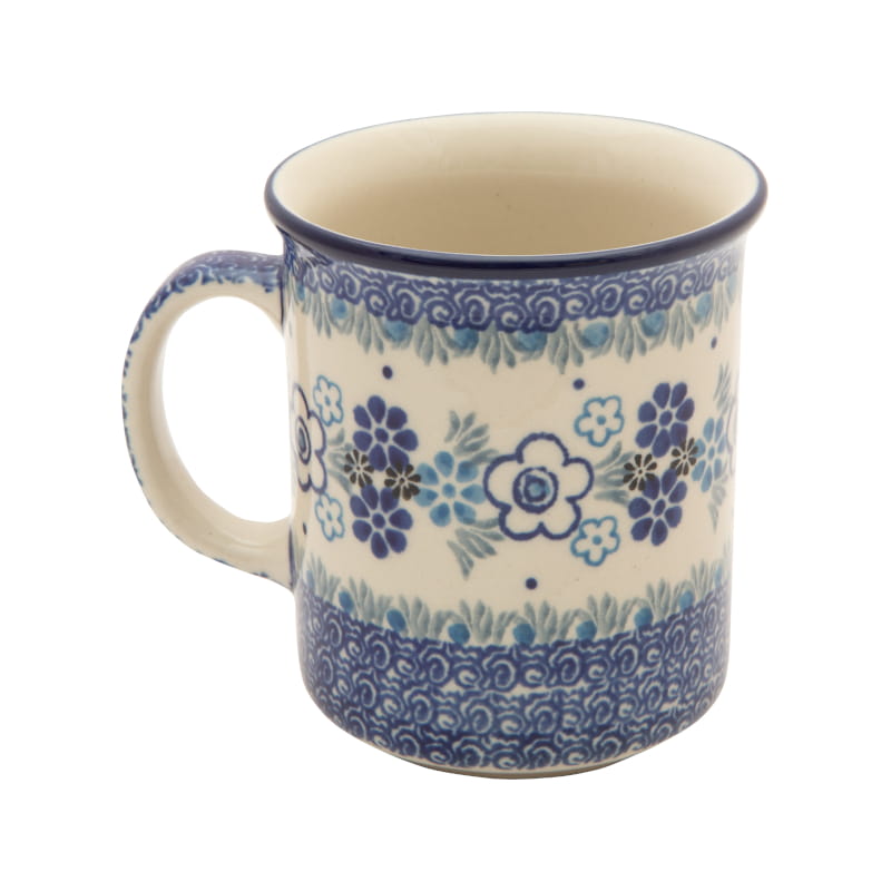 Ceramika Bolesławiec - HANDMADE. Wzór KWIATOWY w kolorze niebieskim. Wykończenie obrzeża w kolorze granatowym.