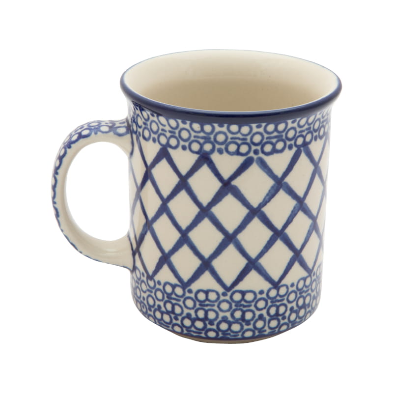 Wzór geometryczny w kolorze granatowym. Wykończenie obrzeża w kolorze granatowym. Ceramika Bolesławiec - Handmade.