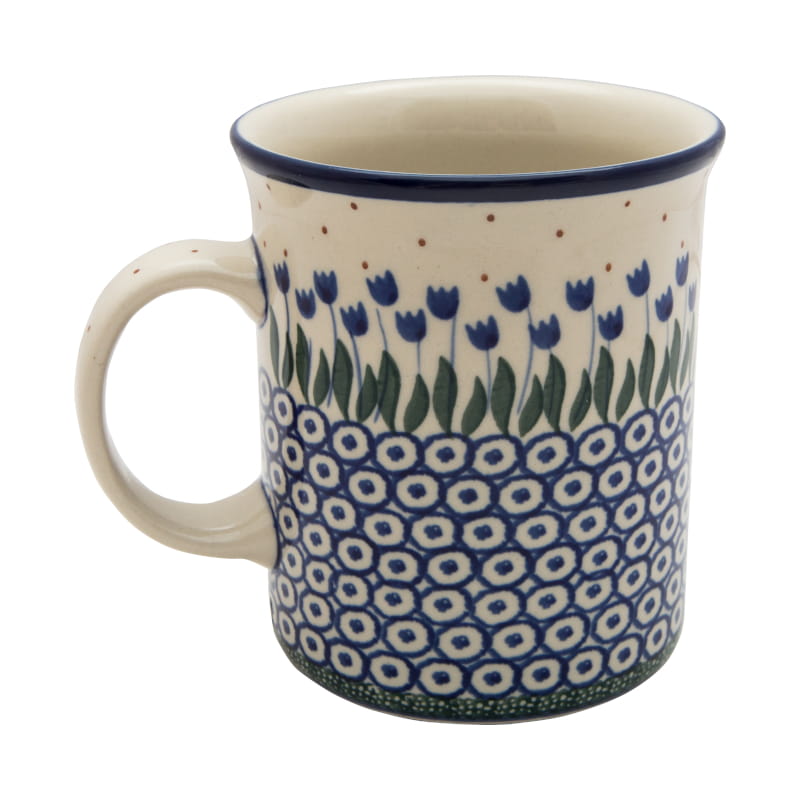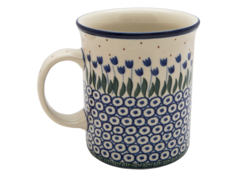 Wzór klasyczny z motywami roślinnymi (tulipany) w kolorach granatowym i zielonym. Wykończenie obrzeża w kolorze granatowym. Ceramika Bolesławiec - HANDMADE.