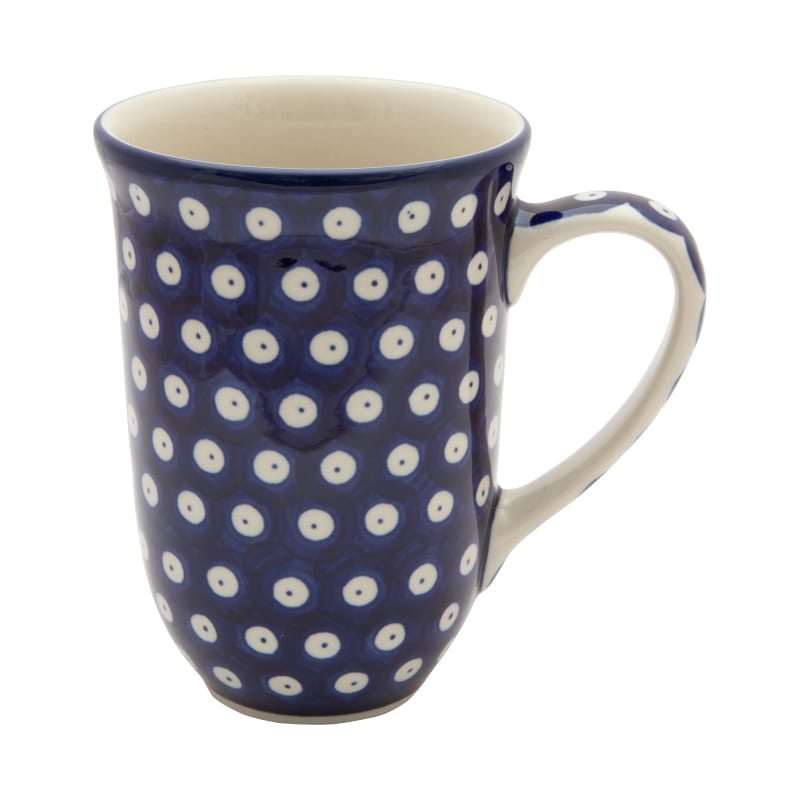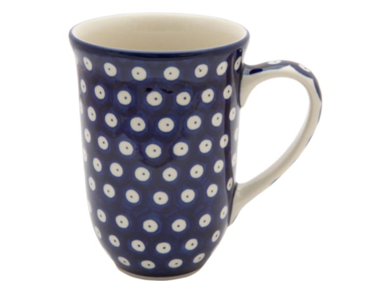 Kubek czeski baryłka z przykrywką, która po zdjęciu służy jako podstawka. Wzór KLASYCZNY z tłem w kolorze granatowym. Wykończenie obrzeża w kolorze granatowym. Ceramika Bolesławiec - HANDMADE.