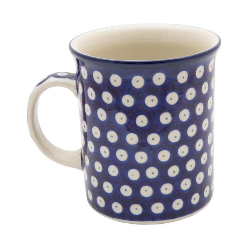 Wzór KLASYCZNY z tłem w kolorze granatowym. Klasyczne kropki Bolesławiec. Wykończenie obrzeża w kolorze granatowym. Ceramika Bolesławiec - handmade.