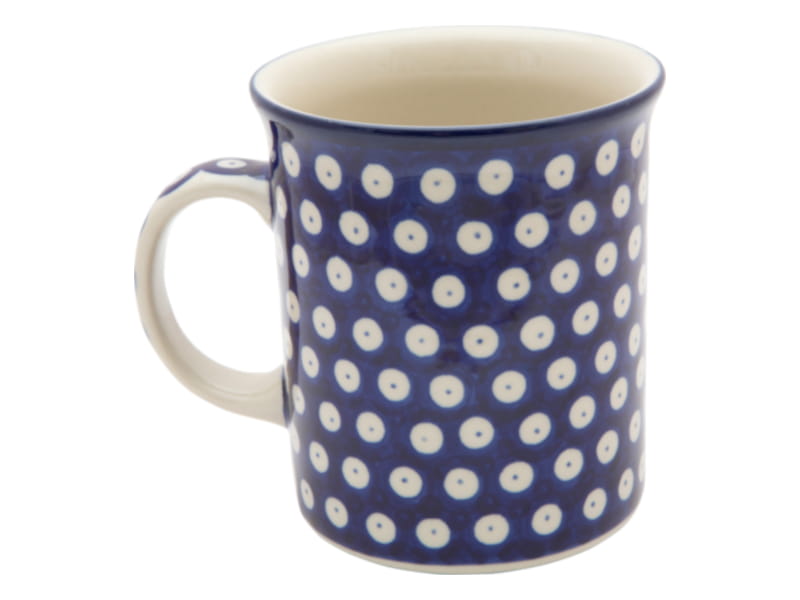 Kubek czeski baryłka z przykrywką, która po zdjęciu służy jako podstawka. Wzór KLASYCZNY z tłem w kolorze granatowym. Wykończenie obrzeża w kolorze granatowym. Ceramika Bolesławiec - HANDMADE.
