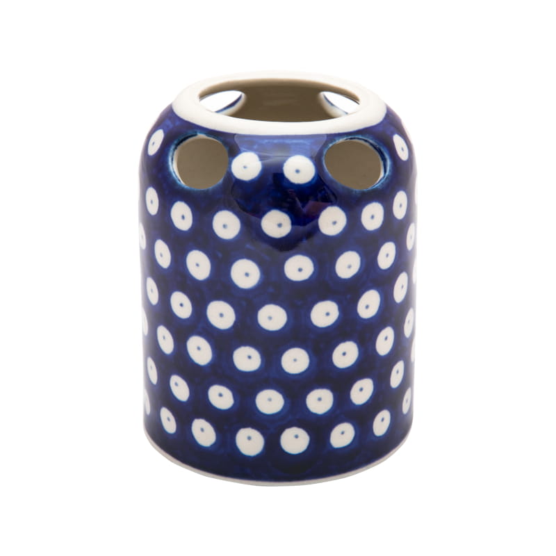 Kubek posiada 4 otwory na szczoteczki i jeden większy na pastę do zębów. Wzór KLASYCZNY z tłem w kolorze granatowym. Ceramika Bolesławiec - Handmade.